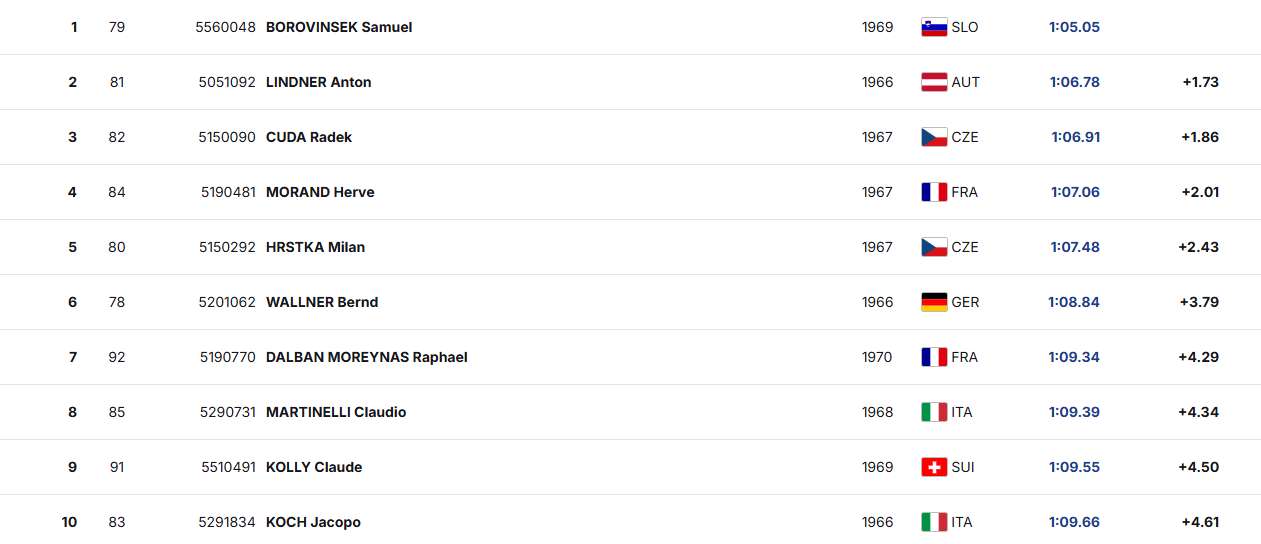 V švicarskem Veysonnazu se je naš Samuel Borovinšek v FIS Masters svetovnem pokalu na prvi tekmi sezone povzpel na najvišjo stopničko. V najštevilčnejši kategoriji od 55 - 59 let se je na zahtevni in razgibani progi znašel najbolje in z več kot sekundo prednosti pometel s konkurenco. S tem rezultatom je seveda tudi prevzel vodstvo v skupnem seštevku. Bravo Samo!